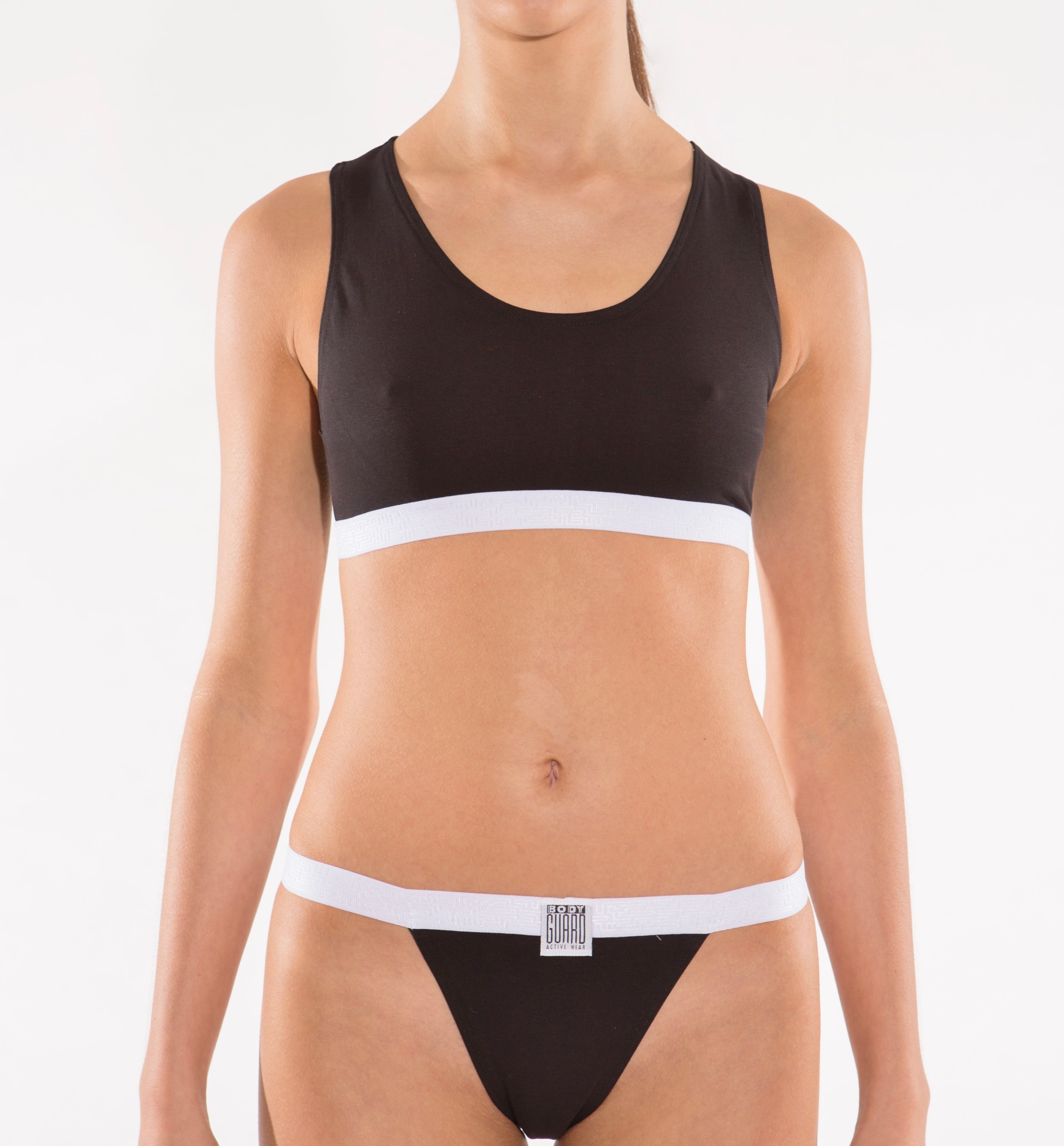 Unser Bustier vereint klassischen Komfort mit modernen, stilvollen Details. Die breiten Träger und der Ringer-Ausschnitt im Rücken sorgen für eine trendige Optik und ausgezeichneten Halt. Der breite elastische Bund mit griechischem Meander-Muster setzt einen eleganten Akzent, während das aufgenähte Logo das Design dezent abrundet.