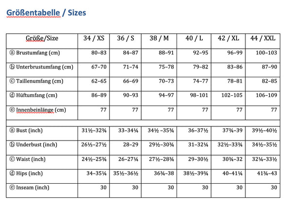 Hierfür brauchst du den Brustumfang (A), den Taillenumfang (C) und den Hüftumfang (D). Solltest du dich zwischen zwei Größen befinden, empfehlen wir dir die größere Größe, wenn du größer als 173 cm bist und die kleinere, wenn du kleiner als 162 cm bist.